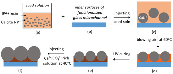 Schematic illustration of the process to coat the inner surfaces of microchannel with micron-sized calcite particles. (a–c) a seed solution, containing calcite nanoparticles and photocurable polymer is injected into the functionalized 2.5D glass microchannel. (c,d) blowing with hot air removes the solvent and promotes surface-binding of the CalNPs. Steps (a–d) are repeated three times. (d,e) exposing to UV light solidifies the matrix and enhances the CalNP immobilization. (e,f) adding a solution rich in Ca2+ and CO32− leads to outgrowth of the exposed CalNP surfaces. This step is repeated four times. Drawings are not to scale, and calcite crystals are simplistically represented as spheres.