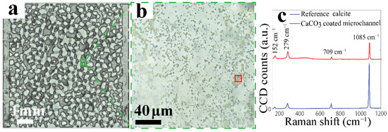 (a,b) Optical images of the calcite coated 2.5D glass microchannel: (a) Entire microchannel and (b) at randomly chosen deep pore at 50× magnification. (c) Representative Raman spectra of the calcite particles grown on the glass surface (red) and reference calcite (blue).