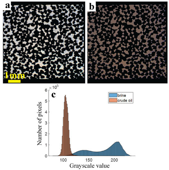 Masked color images of the deep pores filled with (a) formation water and (b) crude oil at 22 °C, and (c) the grayscale intensity histograms derived from them. Pixels corresponding to the areas that are filtered out by the mask have a gray value of zero and are not shown.
