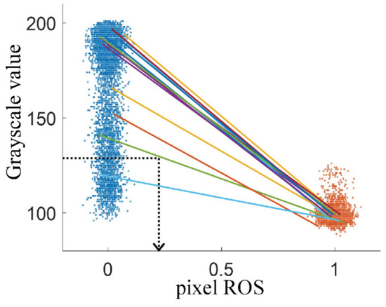 To address these shortcomings, we also implemented an interpolation method for calculating ROS. This method is also pixel-based but uses the grayscale intensities as measured in the FW-filled (ROS = 0) and CRO-filled (ROS = 1) chip to define a unique calibration line for each pixel. Figure 4 illustrates the working principle: each line (only a few are drawn) connecting a point in the FW-cloud to a point in the CRO-cloud, corresponds to a specific pixel. This line is then used for calculating the ROS value of that pixel (which changes during waterflooding), via linear interpolation. The grayscale values of FW and HSW are here considered to be the same. This calculation method avoids the error that is introduced by thresholding all pixels with the same grayscale value, and returns fractional ROS values per (X,Y) pixel. As a remark, Figure 3 also implies that with optical microscopy, the presence or absence of calcite particles cannot be confirmed for the pixels that are covered by CRO.