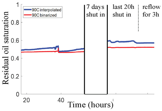Long duration measurement of the residual oil saturation (calculated with two methods as before) at 90 °C. The labels on the time axis refer to the time lapse since the experiment was started at 22 °C (see Figure 6a).