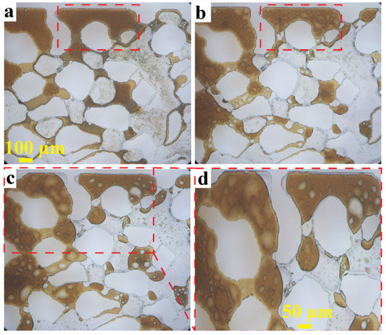 Aqueous drop formation and swelling during exposure of CRO to high-salinity water: (a) after 3.5 h at 22 °C, (b) after an additional 48 h at 90 °C (c) after a shut-in period of 8 days, (d) Zoom-in of a part of panel (c). Red boxes illustrate regions where the swelling of brine drops gradually occurs over time.