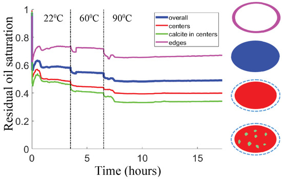 Figure 6 shows that the effect of the waterflooding temperature on the residual oil saturation depends on temperature history. The solid lines show the experiment where the HSW flooding was initiated at 22 °C and the temperature was subsequently raised to 60 °C and 90 °C. The ROS decreases from 100% to ~57% after 3 h at 22 °C, decreases further to ~53% after 3 h at 60 °C and drops further to ~49% after 3 h at 90 °C. For comparison, the experiment where the waterflooding was initiated at 90 °C (dashed lines) reaches a ROS of 32/41% after 3 h. In other words, comparing the ROS plateaus at 22 °C and 90 °C within the 22-60-90 °C experiment, the ROS decrease is only ~8%. Meanwhile, comparing the initial ROS plateaus between the two experiments (at 22 °C for the solid lines and at 90 °C for the dashed lines), the difference is much larger at 16–25%. Hence, the qualitative trend is that ROS decreases with temperature, but the quantitative change is bigger if we compare the conditions of the first flooding.