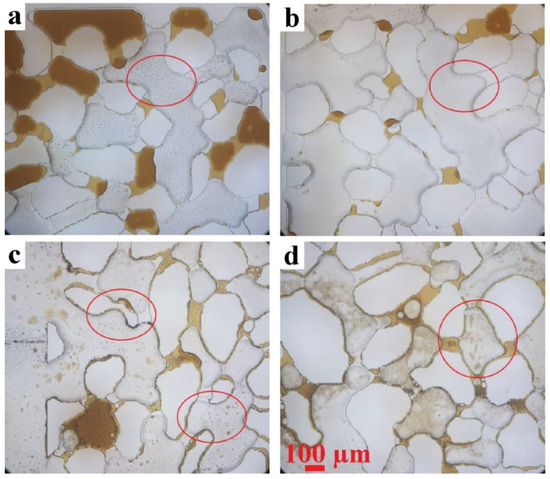 Comparison of the oil-retaining tendencies of the pore edges in (a,b) glass (ref. [37].) and (c,d) calcite-coated microchannels, at 90 °C and using HSW as the brine. Red circles show the differences in edges with and without retention of CRO.