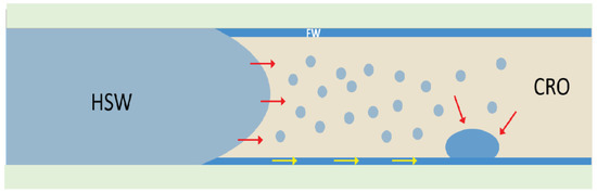 Hence, a similar ‘osmotic’ swelling in the reported previous studies [57,58,59,60] would occur, but now involving HSW as the ‘lower salinity’ brine. In our sketched picture, the aqueous blisters are thus formed at a pore wall. The effect of the blisters on the release of CRO appears to be insignificant. Simultaneously with the growth of the brine slugs, the CRO also appeared to accumulate in some of the pores. These CRO slugs were not pumped out after the flow was resumed.