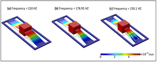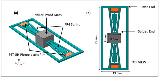 Figure 1 depicts the schematic diagram of the proposed nonlinear PEH. The nonlinear harvester comprises an exsect-tapered spring geometry fixed on two opposite sides by a fixed outer frame. The outer frame holding the ends of the beam is fixed while the rest of the structure is free to move such that the proof mass guides the other ends of the beam at the center, which can now be considered a fixed-guided set of beams (spring structure). The beam spring is made of 0.5 mm-thick FR4 (woven fiberglass embedded in flame retardant epoxy resin), which aids in lowering the operating frequency owing to its low Young’s modulus. As shown in Figure 1a, a central NdFeB proof mass of 8 mm × 8 mm, for reducing the resonant frequency, is suspended at the guided end of both beams to offer an even mass distribution in the harvester. NdFeB material was selected for the proof mass to be consistent with prior literature, thus ensuring a proper comparative study [34,37,38]. The spring area near the fixed ends of the device is covered by two PZT-5H piezoceramic regions of 3 mm × 0.2 mm, which are electrically isolated from each other. The FEM simulation of the harvester shows that the four eigen-modes are at 150.1, 352.8, 712.93, and 351 Hz, where the first mode has out-of-plane motion, and the latter modes have tilt and flip modes (Figure 2).