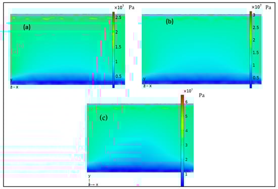 The distribution of stress in PZT-5H piezo film of the nonlinear PEHs: (a) rectangular, (b) tapered, and (c) exsect-tapered.