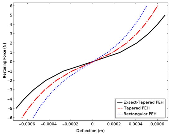 here is the spring restoring force, is the linear stiffness constant due to bending of the FR4 spring, and is the cubic stiffness constant due to stretching of the FR4 spring. Geometric nonlinearity is considered in the FEM model. The bending and stretching due to the large deformation of the structure causes nonlinear behavior. The stiffness coefficient constants and were identified by finite element analysis using a Stationary Study by applying different body loads to the proof mass and measuring the corresponding relative deflections in the z-axis direction. Figure 5 shows the resulting force vs. displacement data, and the polynomial fitting technique in ORIGIN software (version 8.5.0, OriginLab Corporation, Northampton, MA, USA) was used to determine the stiffness coefficients and . For the initial deflection, the returning force of FR4 springs replicates the structure bending. After the deflection exceeds a certain value close to the thickness of the beam spring, the structure shows nonlinear behavior induced by stretching, and in that case, the spring restoring force involves both linear bending and stretching-induced components. The stiffness coefficients of all the PEHs are summarized in Table 1. It is observed that the coefficients and of a conventional rectangular PEH are greater than those of the tapered PEHs, which accounts for its high frequency. The tapered PEHs have a difference in , but the of the exsect-tapered PEH is much smaller than that of the simple-tapered one. Therefore, the introduced exsect-tapered structure can reduce the operational frequency and provide sufficient nonlinear stiffness, which facilitates low and broadband ambient vibration harvesting. The nonlinearity degree can be increased by reducing the tapering ratio and thickness of the spring beams [40].