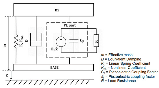 The dynamic model of the nonlinear system can be approached as a lumped system of a mechanical vibration unit and a piezoelectric (PE) unit, as shown in Figure 7. Then, the differential equations governing the electromechanical coupling system are described by