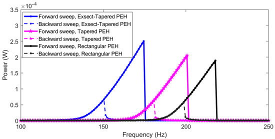 For low input excitation, the frequency response is almost a linear harvester since the stiffness coefficient is dominant when compared to the cubic coefficient ; therefore, the nonlinear behavior of the response curves is not apparent. Figure 9 shows the response for a low input excitation of 0.001 g. The maximum RMS powers generated from the rectangular, tapered, and exsect-tapered PEHs are 1.22, 1.477, and 2.577 nW at 196.6, 178.5, and 150.3 Hz, respectively. The numerically simulated fundamental frequencies are close to the FEM simulated ones (210, 178.95, and 150.1 Hz). For a low input excitation of 0.001 g, the PEHs can be regarded as linear harvesters.