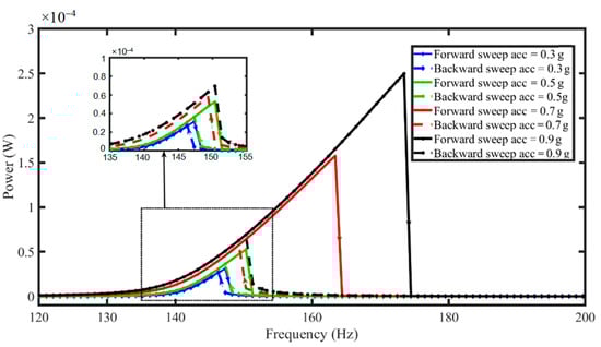 Analytical simulated output power for a varying frequency with load resistance R = 0.27 MΩ and different input excitations (acc) for forward (solid line) and backward (dash line) frequency sweeps in an exsect-tapered nonlinear PEH.