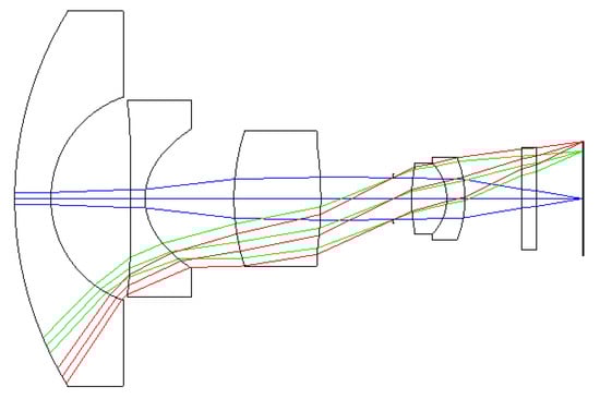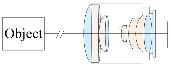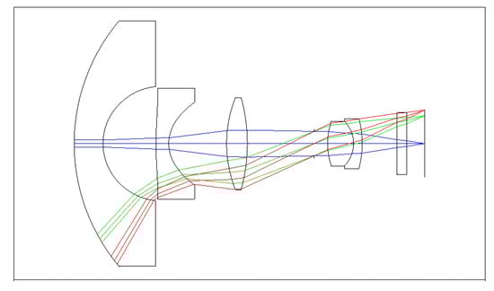 The simplest optical system for aberration compensation is a two-lens-group structure. A compact fisheye objective lens consists of six lenses [14]; the first lens element has a convex surface facing the object and a concave surface facing the image plane. The second lens is an aspherical lens and has a concave surface facing the object and a concave surface facing the image. The third and fourth lenses are single lenses. The fifth and sixth lenses combine to form a positive-power doublet lens. To start with, the Gaussian solution was calculated according to the thin lens theory, and the two-lens group structure (a negative lens group and a positive lens group) was determined by a deep learning algorithm.