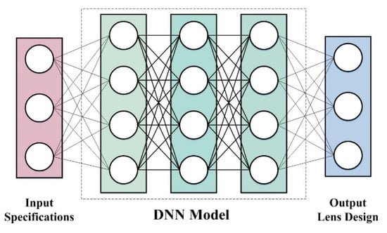 Due to the discreteness and diversity of the lens materials, it is difficult to deal with them in optical lens design software. In the optimization process, it is usually necessary to allow a continuous optimization of the lens variables, even if only a discrete number of glass materials exist, and then fix them at some point in the process. Although these traditional glass variables help to select approximate lens combinations for a first-order optical layout, there may be other more appropriate methods when the goal is to directly optimize the variables or predict them in machine learning applications. We applied a deep learning (DL) algorithm to process the lens data in the wide-angle fisheye lens design. Deep learning is a subfield of machine learning based on artificial neural networks [24,25,26,27]. The first challenge of applying DL to optical design is that a deep neural network (DNN) model can be trained to predict the response of a given design, but the opposite is not possible. A second challenge in applying DL to optical lens design concerns the model uncertainties involved in DNNs and their implication on the correctness and optimization of the designs. However, this issue has remained unaddressed [28]. It can be solved by a deep learning strategy trained to extrapolate data from the lens design database, which can be used to directly select the lens design starting point from the required first-order specifications of the thin lens. There are potential benefits in borrowing some of the tools used in machine learning and deep learning practice and applying them to a wide-angle lens design. Since a deep neural network is trained to extrapolate data from lens design databases, it can be used to obtain a selection of a wide-angle lens design starting points directly from the desired first-order specifications. The deep learning method trains a deep neural network (DNN) model, which learns the mapping from the required input specifications of all required lens variables [29].