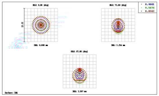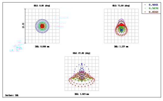 The spot size of a miniaturized wide-angle fisheye lens using a polymethyl methacrylate (PMMA) aspheric lens. The image also shows the RMS spread of the images at three field angles of 0°, 71°, and 87°. The blue, green, and red dots represent wavelengths of 0.4861, 0.5876, and 0.6563 μm, respectively.