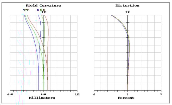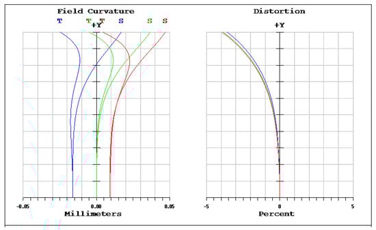 Field curvature (left) and distortion (right) of a miniaturized wide-angle fisheye lens using a polymethyl methacrylate (PMMA) aspheric lens.