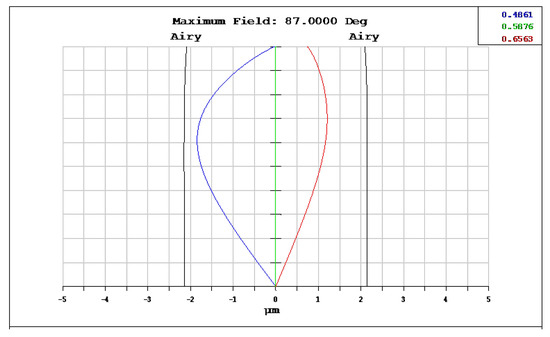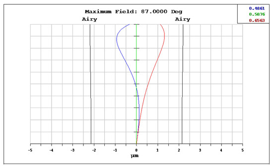 Lateral color of wide-angle fisheye lenses using a polymethyl methacrylate (PMMA) aspheric lens. The blue, green, and red lines represent the wavelengths of 0.4861, 0.5876, and 0.6563 μm.