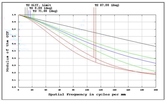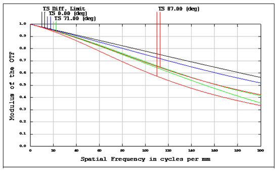 Modulation transfer function (MTF) of wide-angle fisheye lenses using a polymethyl methacrylate (PMMA) aspherical lens. The blue, green, and red lines represent the tangential and sagittal (T = tangential; S = sagittal) directions for the 0°, 71°, and 87°cases, respectively.