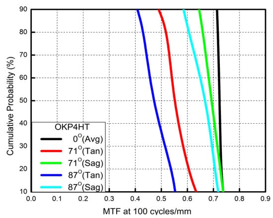 Cumulative probability vs. modulation transfer function (MTF) for a fisheye lens combined with an OKP4HT aspherical lens. For the cumulative probability of 90%, the tangential MTF values at the half FOV for the 0°, 71°, and 87°cases correspond to 0.72, 0.48, and 0.41, respectively.