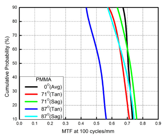 Cumulative probability vs. modulation transfer function (MTF) for fisheye lenses using a polymethyl methacrylate (PMMA) aspherical lens. For the cumulative probability of 90%, the tangential MTF values at the half field of view for the 0°, 71°and 87°cases correspond to 0.67, 0.58, and 0.43, respectively.