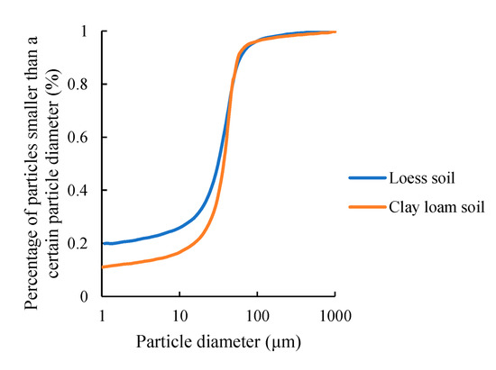 The soil samples were clay loam (11% sand mass fraction, 71% powder mass fraction, 18% clay mass fraction) collected from the Bajia experimental site in Haidian District, Beijing (116.34° E, 40.00° N) and loess (15% sand mass fraction, 65% powder mass fraction, 20% clay mass fraction) collected from an apple orchard in Zhen Yuan County, Qingyang City, Gansu Province (107.03° E, 35.54° N). The grain size distribution curves of the soils are shown in Figure 1.