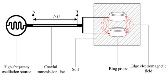 When the high-frequency electromagnetic wave generated by the high-frequency signal source reaches the probe along the coaxial transmission line, the electromagnetic wave is reflected back, owing to the impedance mismatch between the probe and transmission line, and the incident and reflected waves form a potential difference at both ends of the coaxial transmission line [25,29,30], as shown in Figure 2. During the transmission process, the bimetallic ring probe is positioned within the soil, and any impedance change causes a change in the magnetic field medium, which reflects back along the electromagnetic wave. This leads to the ends of the coaxial transmission line having different potentials, and this change in voltage represents the impedance change in the probe in the soil. As the water content is the main factor causing a change in impedance, the change in voltage between the ends of the transmission line can be used to calculate the soil water content.
