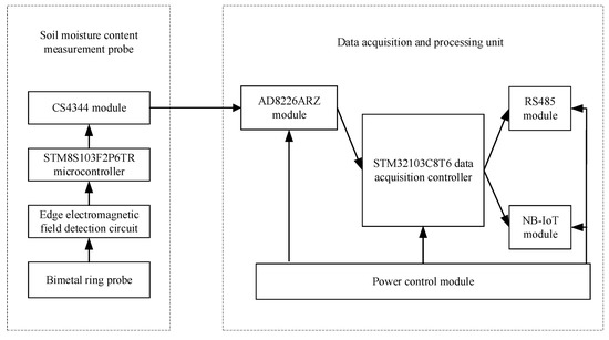 The hardware circuit mainly included the soil water content measurement probe and a data acquisition and processing unit. The hardware circuit system block diagram is shown in Figure 3. The data acquisition processing unit included a data acquisition controller (STM32103C8T6, STMicroelectronics, Geneva, Switzerland), an analog-to-digital converter (AD8226ARZ, Analog Devices Inc., Wilmington, MA, USA), a power control module (K7805-1000R3, Dexu Electronics, Shenzhen, China), a clock control module (RX-8025T, Epson Toyocom, Nagano, Japan), an RS485 module (MAX485ESA, Milkin, Shenzhen, China), and an NB-IoT module (WH-NB73, Wenheng, Jinan, China). The soil water content measurement probe was developed and designed by us, which included a bimetal ring probe (material is brass, external diameter is 5 cm, edge thickness is 1.5 mm, and height is 3 cm), an edge electromagnetic field detection circuit (Figure 4b), a microcontroller (STM8S103F2P6TR, STMicroelectronics, Geneva, Switzerland), and a digital-to-analog converter (CS4344, Cirrus Logic, Austin, TX, USA). The EEMFI sensor operating voltage was 5 V. The water content measurement probe used the STM8S103F2P6TR processor to collect the edge electromagnetic field detection circuit output voltage signal by writing the normalized calibration parameters and calculating the corresponding digital signal. To collect the water content output voltage value, the CS4344 converter output the voltage signal to the main board through the AD8226ARZ converter after data processing. The measurement results are also uploaded to the Internet of Things (IoT) cloud platform (http://cloud.usr.cn, accessed on 15 January 2021) in real time through the NB-IoT module. The data were communicated according to the recommendation standard 485 (RS485) protocol. A physical diagram of the sensor is shown in Figure 4a, and the cost of the EEMFI sensor was only USD 100 (Table 1); the prices of some commonly used soil moisture sensors are shown in Table 2. The bimetal ring probe was processed by contacting a local metal fabricator for the hardware measurement circuit. We designed the circuit ourselves and commissioned a PCB fabrication company to make the measurement circuit board through the Taobao website, and the housing was independently printed using 3D printing equipment.