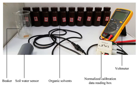 The configured solutions with different dielectric constants were poured into the beaker in turn; then, the EEMFI sensor probe was placed into the beaker and the normalized calibration data reading box, with one port for connecting to the sensor and the other port for connecting to the voltmeter. The voltage value output from the sensor probe was then recorded with a voltmeter. The normalized calibration site is shown in Figure 5. The above steps were repeated to measure the corresponding voltage values and dielectric constant solutions and to perform data fitting to establish the normalized calibration model in Equation (10).