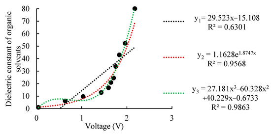 Using the techniques described in Section 2 [32,33,38], the output voltage of the edge electromagnetic field detection circuit under the corresponding dielectric constant solution was measured, and linear, exponential, and third-order polynomial fits were selected. Figure 6 shows the fitted coefficients of determination for the three forms of fit, which were 0.6301, 0.9568, and 0.9863, respectively. The best fit was clearly obtained using the polynomial fit; therefore, the constant term coefficients of the normalized calibration model in Equation (10) were , , , and . By writing the constant term coefficients , , , and into the memory of the probe’s STM8S103F2P6TR processor, the normalized calibration of the EEMFI sensor probe was completed. Normalizing the calibration so that every probe outputs a 0–2.5 V analog signal ensures the easy interchangeability of any two probes, thus improving the replaceability and versatility of the EEMFI sensor probe.