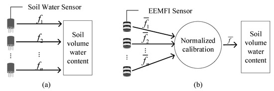 Figure 7b shows the normalization calibration schematic by normalizing the mapping relationship between the output voltage and the dielectric constant of the EEMFI sensor (,···) and eliminating the influence of the EEMFI sensor device. Subsequently, the mapping relationship between the dielectric constant and water content is established for different soils, with n sensors in m soils. For use with m soils, the EEMFI sensor is first calibrated n times to make its output consistent, and then only m secondary calibrations are required for the soil, and a total of n + m calibrations are needed. Therefore, we called the number of calibrations required . The number of sensor calibrations is under the conventional method and under the normalized method. and can be calculated using Equations (13) and (14).