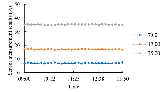 Stability indicates the variability of the sensor output over a long period in the same environment or under multiple measurements [40,42]. The EEMFI sensor was placed into configured soil samples (sample volume water content of 7.00%, 17.00%, and 35.20%), and the sensor measurements were read at ten-minute intervals, with 30 measurements per sample. The data variation curve obtained is shown in Figure 9. The maximum standard deviation of the measurement results was 0.24%, and the maximum extreme value distribution was 1.09%. The fluctuation in the sensor measurement results was very small, and from the results, it was obvious that the sensor output results had good stability [40,42] and could be used for repeated measurements.