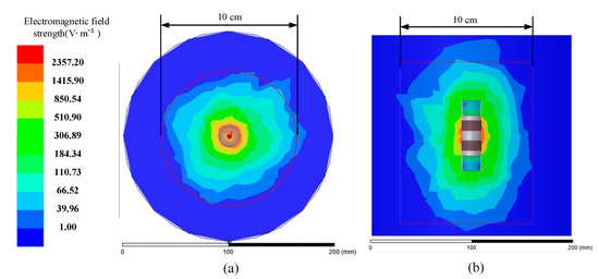 Kafarski et al. analyzed soil moisture probes via electromagnetic simulation and showed that the electromagnetic radiation range of the ring probe is closely related to the range of moisture variation it can measure [44]. The simulation results (Figure 11) using the HFSS software showed that the closer to the outer edge of the probe, the stronger the electromagnetic field, and vice versa. Clearly, the simulation results were consistent with Kafarski’s conclusions. When the electromagnetic field was more than 10 cm in diameter, the electromagnetic strength was less than 1 V/m. At this time, the EEMFI sensor probe was unable to effectively sense changes in the surrounding magnetic field, which indicated that the EEMFI sensor’s sensitive range for the probe was 0–5 cm from the center, or a measurement diameter of 10 cm.
