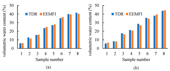The soil water contents of the samples to be measured were determined under laboratory conditions with the EEMFI and TDR sensors, and a comparison of the measurement results is shown in Figure 12. In the clay loam and loess samples, the soil water content measured by both sensors was nearly the same. A linear fit analysis was performed for the EEMFI and TDR sensor measurement results and the fitted coefficients of determination were 0.9932 and 0.9937, respectively. Both fitted coefficients of determination were greater than 0.99, which proved that the EEMFI and TDR sensor measurement results had a good linear correlation, indicating that the accuracy of the EEMFI sensor results are comparable to those of the TDR sensor [34,45,46] and meet the practical application requirements. However, compared with the TDR sensor, the EEMFI sensor designed in this study does not have the disadvantages of easy bending of the probe during use and high cost.