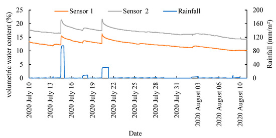 The results of the field experiments are shown in Figure 13. When rainfall increased, the measured water content of the soil also increased, which proved that the sensor can accurately respond to changes in the soil water content. The water content of the soil measured by Sensor 2 was significantly greater than that of Sensor 1, which proved that the closer to the soil’s surface, the stronger the evaporation and infiltration of water, and the weaker the soil’s ability to retain water [48,49,50]. Additionally, the rapid increase in soil water content after rainfall not only indicated a significant relationship between rainfall and soil water content but also indicated that rainfall is the main source of water in the soil [51,52]. However, controlling soil irrigation by hand is the most important tool in plant cultivation [53,54].