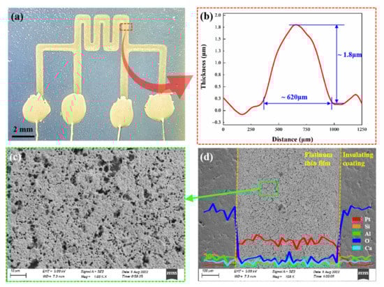 Figure 3a shows the optical image of the printed Pt TFSG. The direct writing process was affected by parameters such as ink viscosity, substrate surface roughness, substrate moving speed, and microneedle rotation speed, so the line width and film thickness of the fabricated samples were different, resulting in different resistances between samples. The resistance of 10 printed platinum sensors was measured at room temperature of 25 °C, and the average resistance was calculated to be 70.5 Ω, the maximum resistance was 75.7 Ω, and the minimum resistance was 65.3 Ω. The Pt TFSG selected for electrical characterization had a resistance of 71.8 Ω at room temperature. The thickness of the strain grid was 1.8 μm and the line width was 620 μm (Figure 3b). Figure 3c shows the micromorphology of the Pt TFSGs. The continuous, uniforms and dense structure ensured that the sensitive film had excellent strain response and electrical conductivity. The EDS analysis (Figure 3d) proved that the main component of the film is Pt.