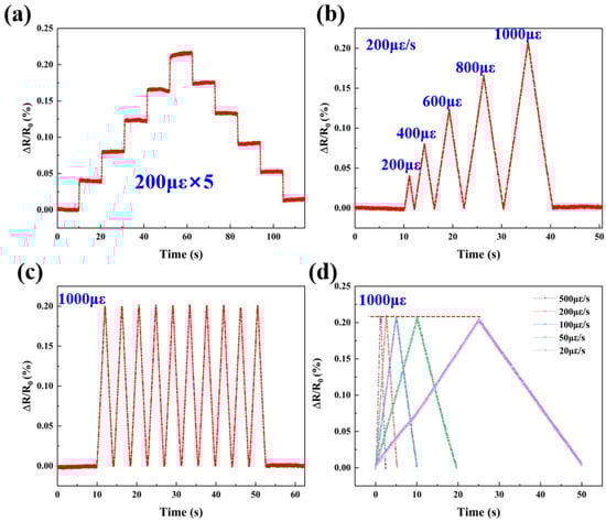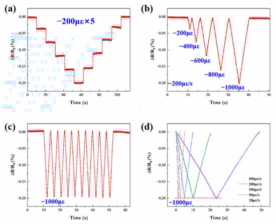 Figure 5a–d shows the strain response of Pt TFSG under negative strain (compressive strain). Similarly, Pt TFSG exhibited good stability under negative static strain. Under negative dynamic strain, the Pt TFSG exhibited a consistent strain pulse signal. Under negative variable-speed strain signals, Pt TFSG exhibited strain-rate independence. This indicated that Pt TFSG prepared by DIW can be used for dynamic/static strain monitoring and sensing of structural components.
