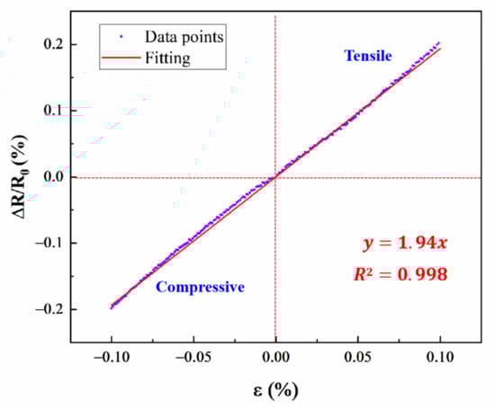 The gauge factor of Pt TFSG could be calculated from the ratio of resistance change rate to strain. In the Figure 6, the slope of the straight line was the GF of Pt TFSG. By calculation, its gauge factor was 1.94. This value was a comprehensive representation of the strain at the Pt TFSG, including the dimensional change and the resistivity change of the strain gauge when it was strained, and the ability of the strain to transfer from the nickel-based alloy substrate to the metal layer was also included []. The GF is reported to be in the range of 1.95–2.5 for most metal/alloy strain sensors [,,].