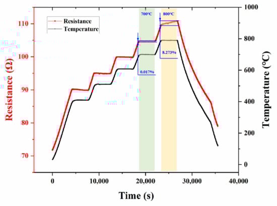 High temperature resistance stability is also an important capability of TFSG. The resistance as a function of heating and holding time is plotted in Figure 7. For the heating stage, the resistance of Pt TFSG increased with the increase in temperature, showing a positive temperature coefficient of resistance. For the holding stage below 700 °C, there was little change in resistance. For example, at 700 °C for 1 h, the resistance only increased by 0.017%. Since the GF of Pt TFSG was 1.94, the strain error caused by resistance drift at 700 °C for 1 h was only 87 με, indicating that Pt TFSG has good thermal stability. After holding at 800 °C for 1h, the resistance of Pt TFSG increased by 8.2%, and the increase of resistance of Pt film was related to high temperature oxidation []. All the above test results demonstrate that the Pt TFSG fabricated by DIW had good thermal stability in the temperature range from room temperature to 700 °C, and the thermal stability at high temperature was the first design principle of high temperature TFSG [].