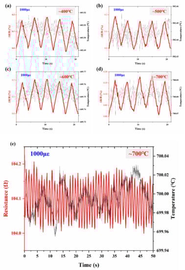 The strain responses of Pt TFSGs were performed at 400 °C, 500 °C, 600 °C, and 700 °C using a high-temperature strain testing system. As shown in Figure 8, a strain of 1000 με was applied at a frequency of 0.25 Hz at high temperature and the change in resistance was recorded. It can be observed from the figure that the GF of Pt TFSG also did not decrease significantly up to 600 °C, which was about 1.9. When the temperature was increased to 700 °C, the GF of the TFSG dropped to 1.7. The synchronized changes in relative resistance at the four temperatures indicated the fast response of the Pt TFSG. The relative resistance change is positively linearly related to the strain. Although its high temperature dynamic strain response is not as good as room temperature, it can be seen from the temperature curve in the figure that the resistance fluctuation was mainly caused by temperature fluctuation. This confirms that the DIW-prepared Pt TFSG can be used for dynamic strain monitoring of high temperature up to 700 °C. As shown in Table 1, its high-temperature withstanding capability was better than most TFSGs that have been reported [,,,,,,,,].
