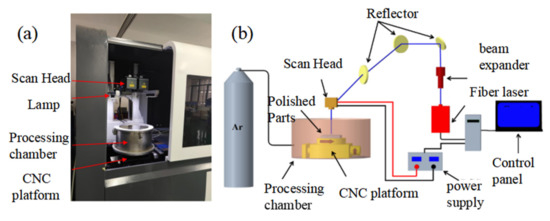 The principle of the laser polishing test equipment and the schematic diagram are shown in Figure 1. The device consists of a laser generator, a scanning mirror (dynamic focusing system), a beam expander (model: 2.8-355-200 m, JGZ Optical Technology Co., Ltd., Shenzhen, China), a closed cavity, an inert gas bottle, a water cooler, and a two-dimensional numerical control platform. The function of the scanning mirror is to adjust the laser beam position to ensure that the laser illuminates on the surface of the sample. To prevent the oxidation of the sample surface during laser polishing, argon is used as a protective gas, which will not react with the material. The two-dimensional CNC platform is used to realize the deflection or rotation of the sample.