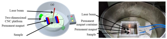 Sample sizes of 70 × 20 × 5 mm3, 70 × 10 × 5 mm3 and 10 × 10 × 5 mm3 are used in magnetic field-assisted laser polishing, and the region of laser polishing is 9 × 9 mm2. The permanent magnet is made of NdFeBN52 strong magnet with a size of 80 × 10 × 10 mm3, which is used to provide a stable magnetic field for the molten pool. The container of the permanent magnet is made of aluminum and the size is 110 × 33 × 18 mm3. To produce a higher flux density, a group of magnets consisting of two magnets is arranged on both sides of the sample, as shown in Figure 2. Fill the container with water to cool the magnet and prevent demagnetization of the permanent magnet at high temperature. The magnetic field intensity can be determined by controlling the sample size and the distance between the poles and the number of magnets. The magnetic field intensity is measured using a Tesla meter (model: PFX-035, Lida Magnetic Technology Co., Shenzhen, China).