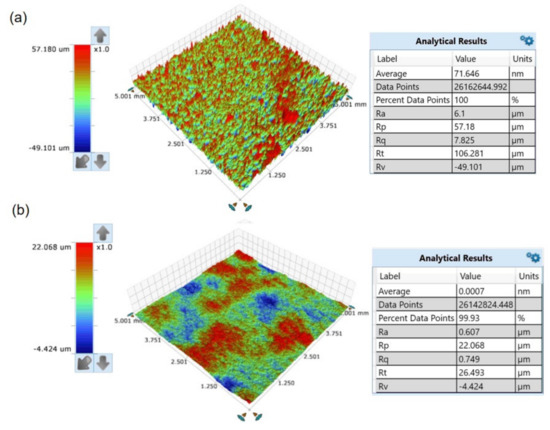 The three-dimensional morphology of the measured sample: (a) initial surface; (b) sample 11 surface with P = 180 W, V = 50 mm/s and MF = 0.3 T.