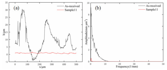 The three-dimensional surface morphology before and after magnetic field-assisted laser polishing was observed using a white light interferometer (model: BRUKER WYKO Contour GT-K, American)), as shown in Figure 5. Under the best polishing process, with a laser power of 180 W, a scanning speed of 50 mm/s, a scanning interval of 0.03 mm, and a magnetic field intensity of 0.3 T, the polished surface roughness of sample can be reduced to 0.607 μm, with a surface roughness reduction rate as high as 90.05%. In addition, the rough surface is further effectively smoothed due to the profile height difference being greatly improved. The two-dimensional surface curve of SKD61 die steel before and after laser polishing was obtained by Fourier filtering, as shown in Figure 6a, where h represents the height of the surface profile and X is the length of the surface profile. The black solid line represents the initial sample outline with Ram = 6.1 μm, and the red line represents the outline of sample 11 when polished with magnetic field. Under the action of the laser heat source, the temperature of the uneven surface above the melting point of the material, and the molten material is redistributed, resulting in a smooth surface being obtained from the molten pool flows. Then, the rapid solidification of the material surface achieves the effect of melting peak and valley filling, reducing the surface roughness and resulting in a smoother surface morphology being obtained. In the above characterization, the surface profile is analyzed only in the direction of the profile height, while the frequency analysis in the transverse space is ignored. The effect of laser polishing on the micro surface cannot be accurately observed. Therefore, power spectral density (PSD) is introduced to analyze the surface topography, where the horizontal axis represents the spatial frequency and the vertical axis represents the amplitude, as shown in Figure 6b. It can be seen that the two power spectral density arcs basically coincide when the spatial frequency is greater than 12 mm−1, and the PSD is attenuated to different degrees when the frequency is less than 12 mm−1, and the amplitude of the polished sample decreases significantly. Compared with the initial surface, the roughness of the polished surface is greatly reduced, and the roughness reduction rate reaches up to 90.05%.