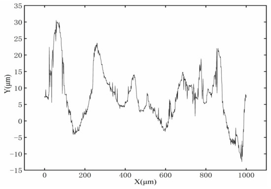 Li Kai et al. [24] studied the effects of three different initial surface contours on laser polishing and found that the initial surface profile was an important factor affecting the final surface roughness of laser polishing. Therefore, the definition of the initial surface is very important in the simulation. In this model, the initial three-dimensional surface topography of the sample is measured using a white light interferometer (Figure 5a), and the two-dimensional profile is intercepted (Figure 7). The two-dimensional profile is filtered using a Fourier filter, and then the filtered curve is imported into COMSOL in the form of an interpolation function. The transient numerical model of free surface melting under the influence of surface tension and the Marangoni effect is established by using the COMSOL multi-physical-field simulation software package.
