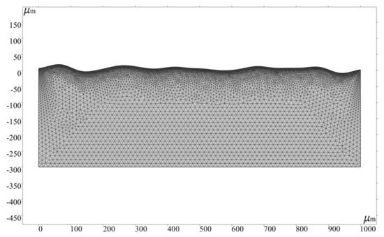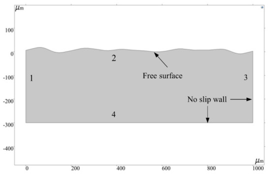 The size of the model area can be determined on the basis of the size of the molten pool obtained by the experiment. In addition, the length of the model is closely related to the width of the molten pool. However, the length of the molten pool is not easy to measure in the laser polishing experiment. Therefore, the length of the model domain is set with reference to the laser spot diameter (d). The beam diameter of the sample surface is 300 μm in the polishing experiments. To ensure that the top surface of the model can present a long enough polished surface profile, the length of the model is set to 3.33 times the diameter of the laser spot, which is 1000 μm. Figure 8 shows the geometry of the model. The width of the molten pool is 1000 μm, and the depth of the molten pool is 300 μm. This model domain not only meets the research needs of this paper, but also saves time when solving this multi-physical coupling model.
