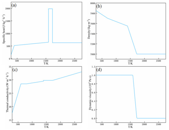 The prepared SKD61 tool steel (4Cr5MoSiV1/AISIH13/DIN1.2344 tool steel) corresponds to the H13 tool steel produced in the United States and the DIN1.2344 tool steel produced in Germany. Therefore, most of the thermophysical parameters employed in this paper are adopted with reference to different types of H13 steel of the same material [8]. The specific parameters are shown in Table 3, and these parameters are related to temperature. For the sake of accuracy, the transition from solidus to liquidus is considered to be a paste region in a certain temperature range. The melting temperature is assumed to be the average of the solidus and liquidus temperatures. In terms of fluid flow, the effective viscosity method allows the liquid phase to flow, but prevents any deformation of the solid portion. The actual dynamic viscosity at liquidus temperature is 5 mPa∙s. Because there is no fluid flow, the viscosity of the solid phase is considered to be infinite. In this study, the viscosity of the solid phase is set to at least 105 Pa∙s, which is several times that of the liquid phase. In addition, the dynamic viscosity decreases steadily from 105 Pa∙s in solid state to 5 mPa∙s in liquid state. In addition, the constructed viscosity corresponds to a “smooth” step function, which can not only describe the difference between liquid phase and solid phase, but also achieve numerical convergence. The rest of the properties of SKD61 materials are constant properties independent of temperature, and their specific values are shown in Table 3.