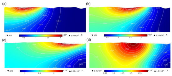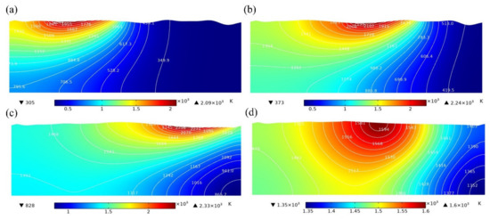 The temperature distribution of molten pool with MF = 0.3 T at (a) t = 5 ms, (b) t = 10 ms, (c) t = 15 ms, and (d) t = 20 ms.