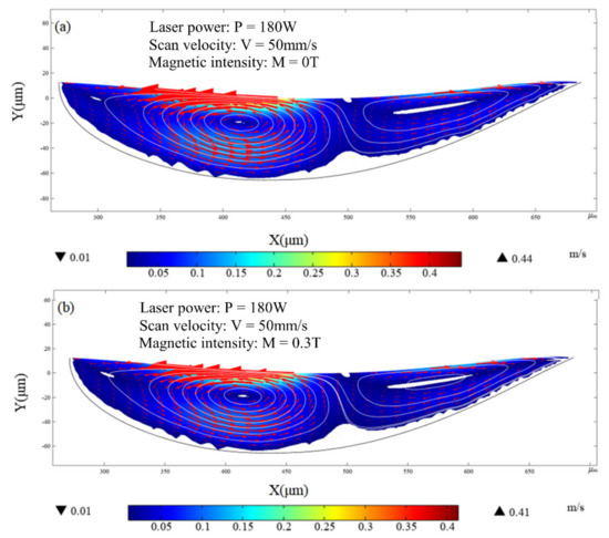 Velocity distribution of fluid in molten pool at t = 10 ms: (a) without magnetic field (MF = 0 T); (b) with magnetic field (MF = 0.3 T).