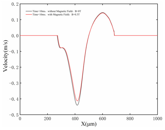 The velocity at the top of the molten pool with and without application of magnetic field at t = 10 ms.