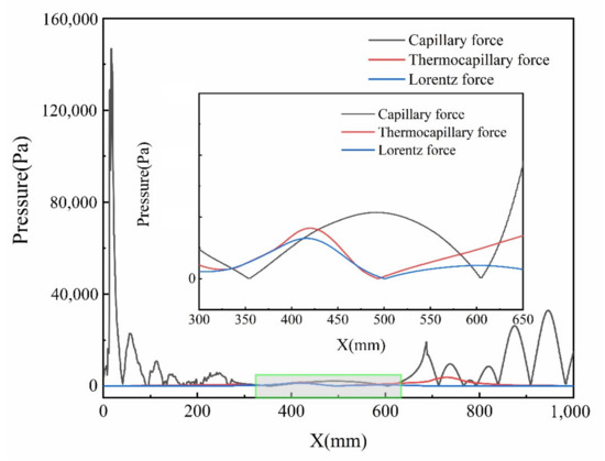 Figure 16 shows the distribution of drive force of molten pool at t = 10 ms. It can be found from Figure 16 that the thermocapillary force exceeds the capillary force and the Lorentz force to dominate the molten pool, where 375 μm < r < 425 μm and 580 μm < r < 620 μm. In addition, the thermocapillary force is almost equal to the Lorentz force, where 330 μm < r < 375 μm. Moreover, it is obvious that the Lorentz force reaches its maximum and has the most obvious effect on the molten pool at X = 400 mm.