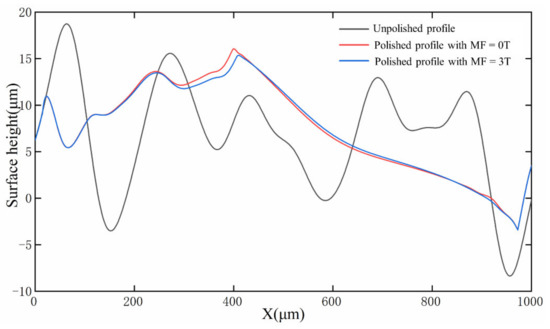Figure 17 shows the simulated surface profile of the unpolished surface, polished without magnetic field and polished with MF = 3 T, at t = 20 ms. It can be observed from Figure 17 that laser polishing effectively improves the irregular peaks and valleys of the matrix, effectively making them smooth. However, the magnetic field has little effect on the surface morphology. In addition, there is a slight decrease in the height of the peaks after laser polishing with MF = 3 T compared with polishing without the magnetic field. As can be seen in Figure 17, the peaks are not equal, mainly due to the melt pool flow velocity being the highest and the Lorentz force having an inhibiting effect on the fluid flow at X = 400 mm, resulting in unequal surface peaks.
